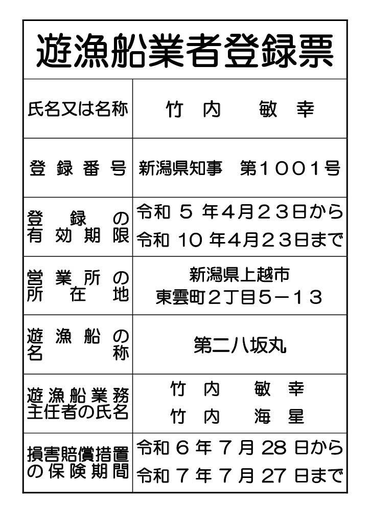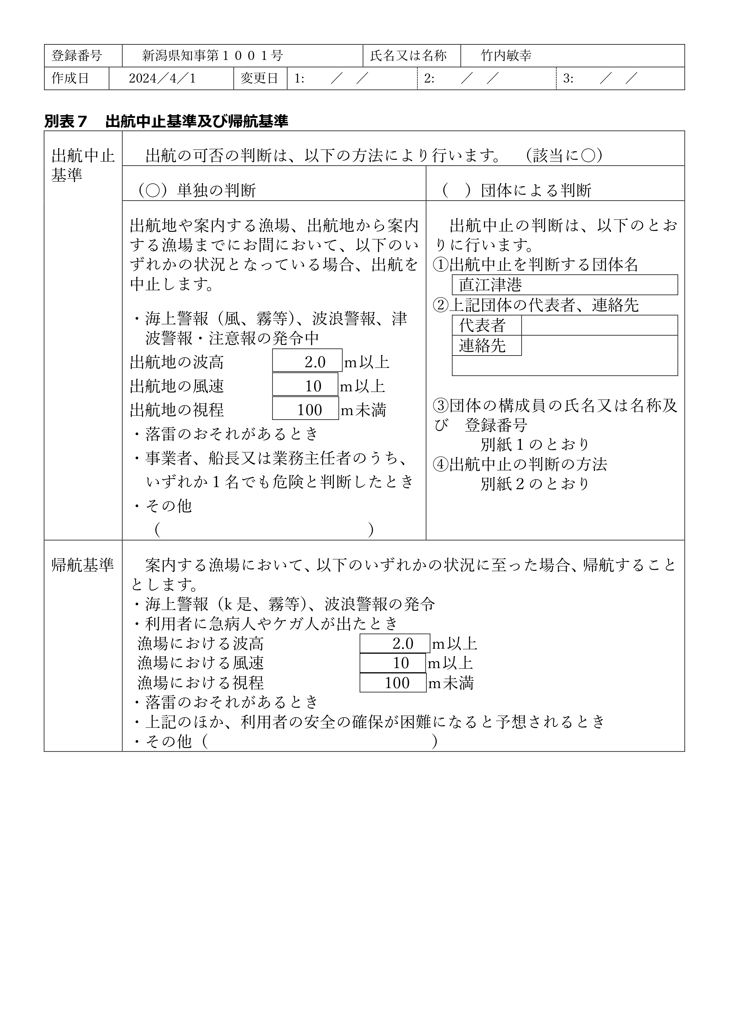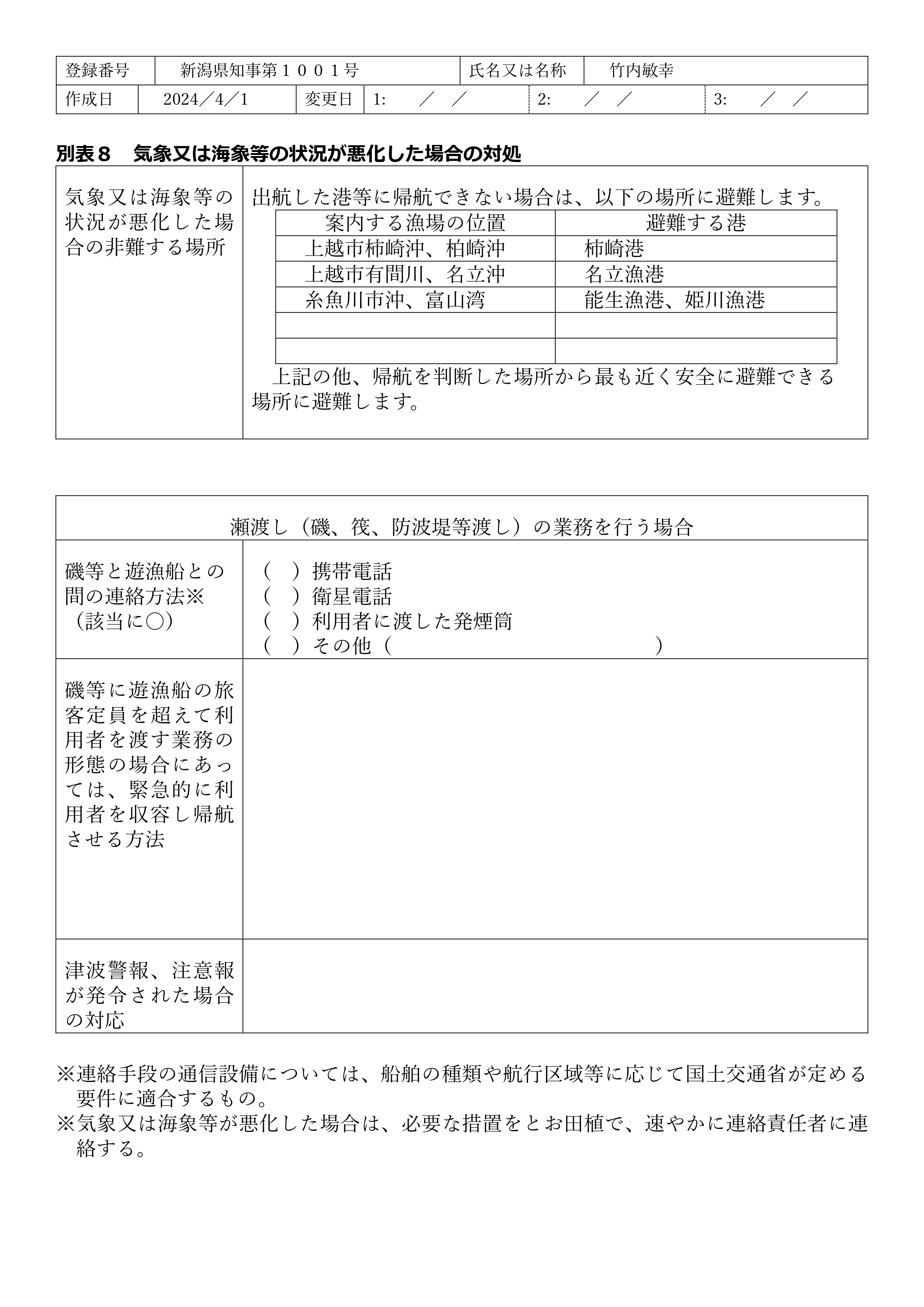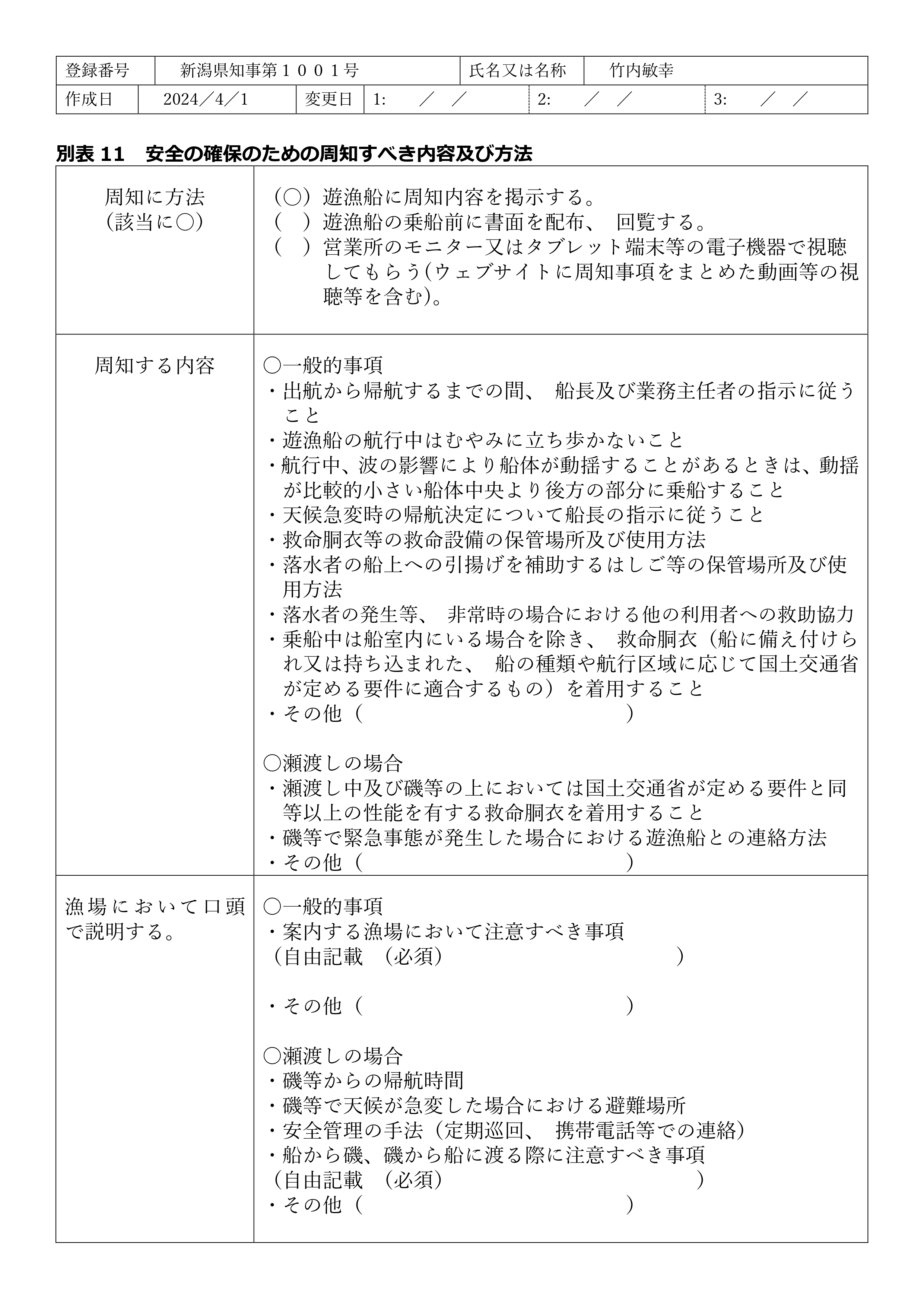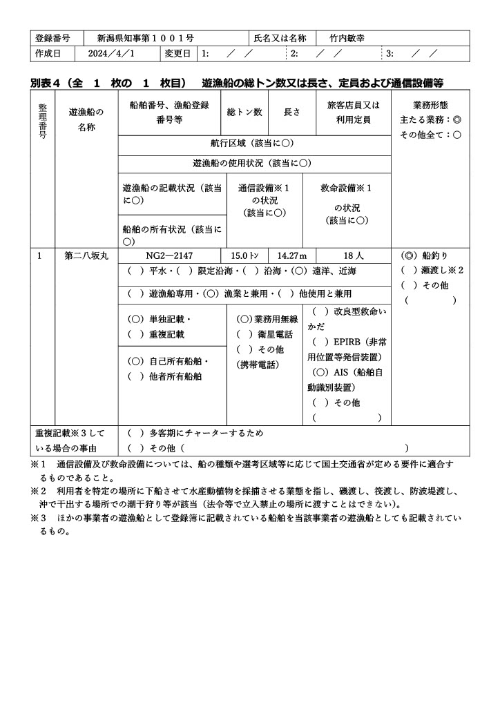 遊漁船の総トン数または長さ、定員及び通信設備等